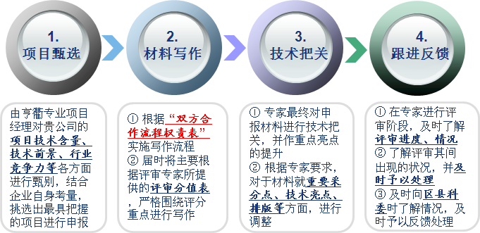 亨衢的專業(yè)團(tuán)隊中不僅擁有從業(yè)多年的專業(yè)項目經(jīng)理,還聘有各類專家,為所服務(wù)的企業(yè)項目進(jìn)行技術(shù)專業(yè)把關(guān),嚴(yán)格按照評審標(biāo)準(zhǔn)的要求完善項目報告,以有效提高申報成功率。